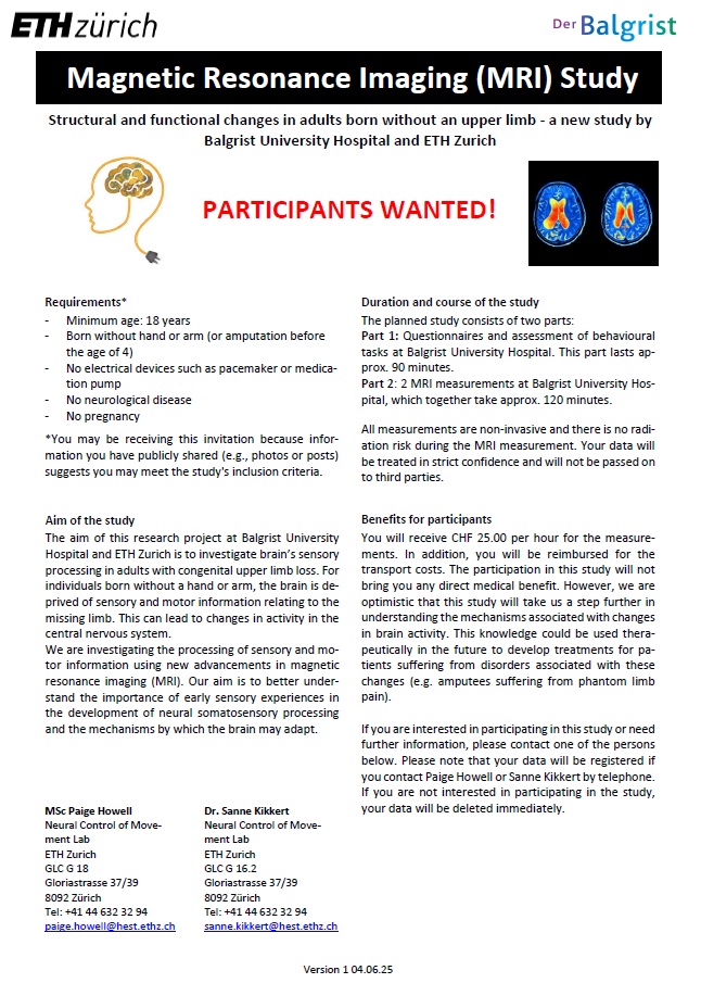 Ik leid een team van onderzoekers in Zürich, Zwitserland (van ETH Zürich en het Balgrist Universitair Ziekenhuis) dat momenteel bezig met een studie waarin we onderzoeken hoe de hersenen sensorische prikkels verwerken in mensen die zonder hand geboren zijn. We zijn daarvoor op zoek naar mensen met dysmelie aan een van de armen om in ons onderzoek deel te nemen. We willen met ons onderzoek uiteindelijk ontdekken hoe beweging en zintuiglijke prikkels, al voor de geboorte en in de eerste levensjaren, bijdragen aan de ontwikkeling van onze hersenen.