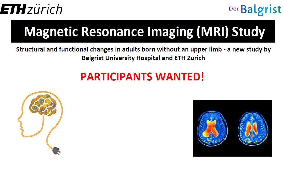 Ik leid een team van onderzoekers in Zürich, Zwitserland (van ETH Zürich en het Balgrist Universitair Ziekenhuis) dat momenteel bezig met een studie waarin we onderzoeken hoe de hersenen sensorische prikkels verwerken in mensen die zonder hand geboren zijn. We zijn daarvoor op zoek naar mensen met dysmelie aan een van de armen om in ons onderzoek deel te nemen. We willen met ons onderzoek uiteindelijk ontdekken hoe beweging en zintuiglijke prikkels, al voor de geboorte en in de eerste levensjaren, bijdragen aan de ontwikkeling van onze hersenen.