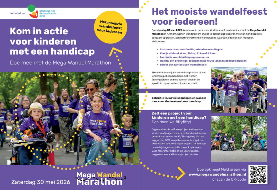 Je kunt namelijk als vereniging meedoen als projectpartner als je een project hebt voor kinderen en jongeren in de leeftijd van 0-30 jaar met een beperking op het gebied van wonen, werken, vrije tijd, scholing of beeldvorming. Dit heet de 50/50 regeling. Dan komt 50% van wat er door jullie team wordt ingezameld rechtstreeks ten goede aan KorterMaarKrachtig, de andere 50% is voor projecten van Stichting het Gehandicapte Kind (samen spelen, samen sporten en samen leren). Als je voor het eerste jaar meedoet, komt zelfs 75% van jullie teamopbrengst direct ten goede aan jullie eigen project voor kinderen met een handicap.